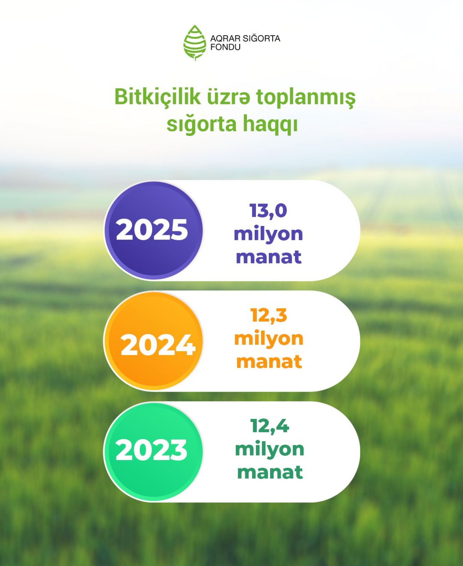 Əkin sahələrinin sığortalanmasından 13 milyon manat aqrar sığorta haqqı toplanılıb. Bunun müqabilində sığorta müqavilələri üzrə əkin sahələrinə 577 milyon manat sığorta təminatı verilib. Əkin sahələrinə verilən sığorta təminatının məbləği 2024-cü illə müqayisədə 64 milyon manat, 2023-cü illə müqayisədə isə 71 milyon manat artıb.