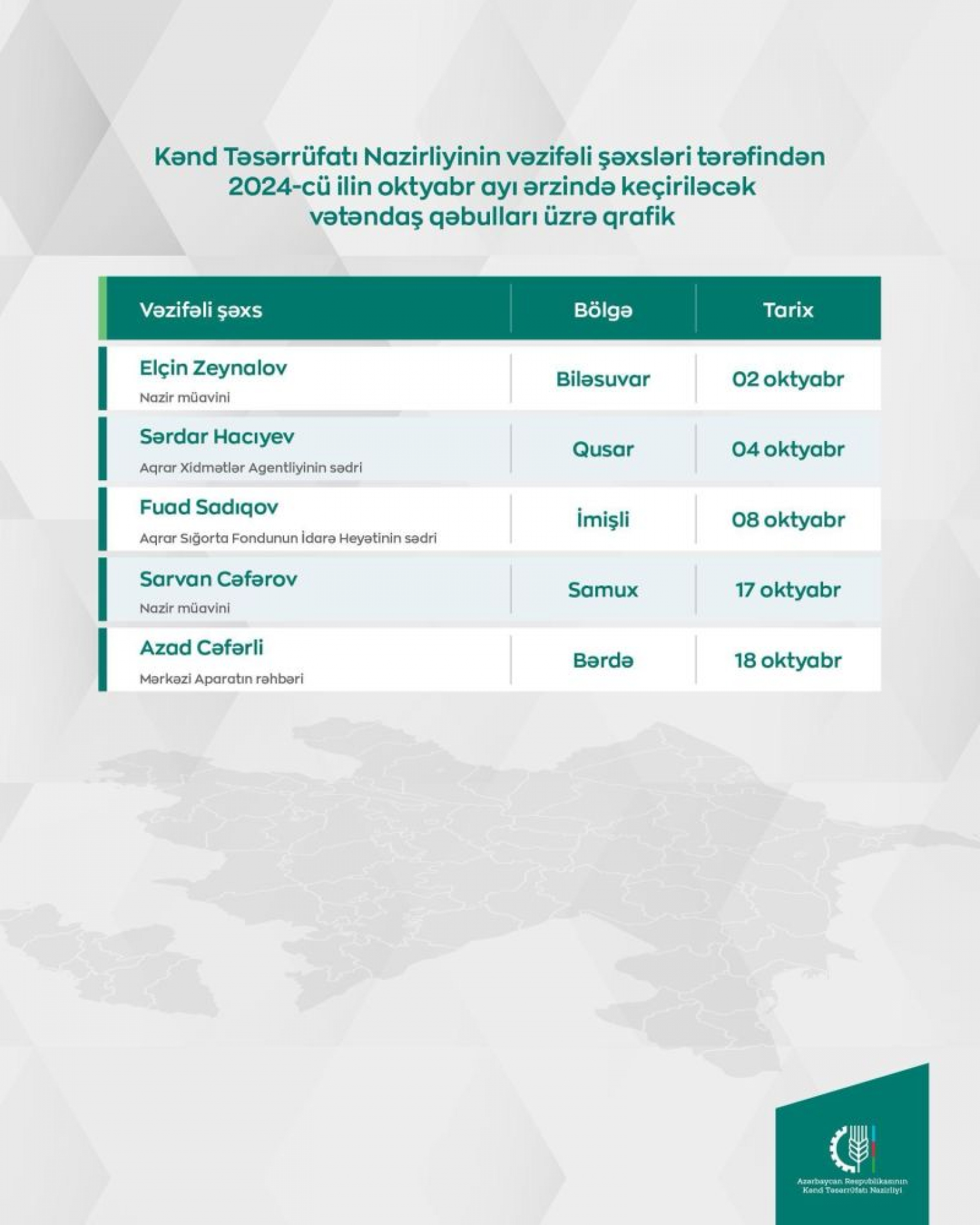 Kənd Təsərrüfatı Nazirliyinin vəzifəli şəxslərinin oktyabrda bölgələrdə keçirəcəyi vətəndaş qəbullarının qrafiki təsdiqlənib
